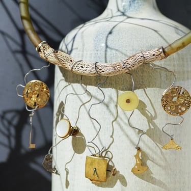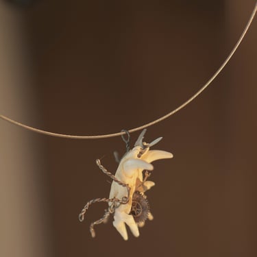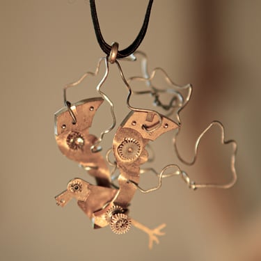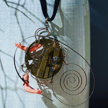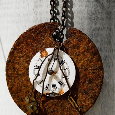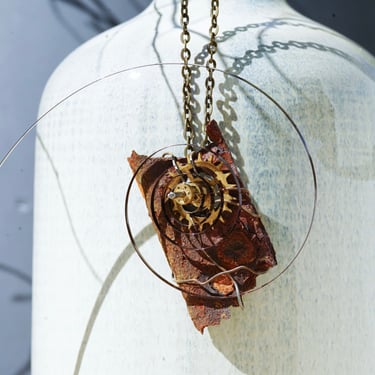 Matériaux recyclés, métaux rouillés, pièces horlogères anciennes et petites trouvailles au gré d’une brocante ou d’une promenade, tels sont les matériaux utilisés pour la création de mes bijoux.